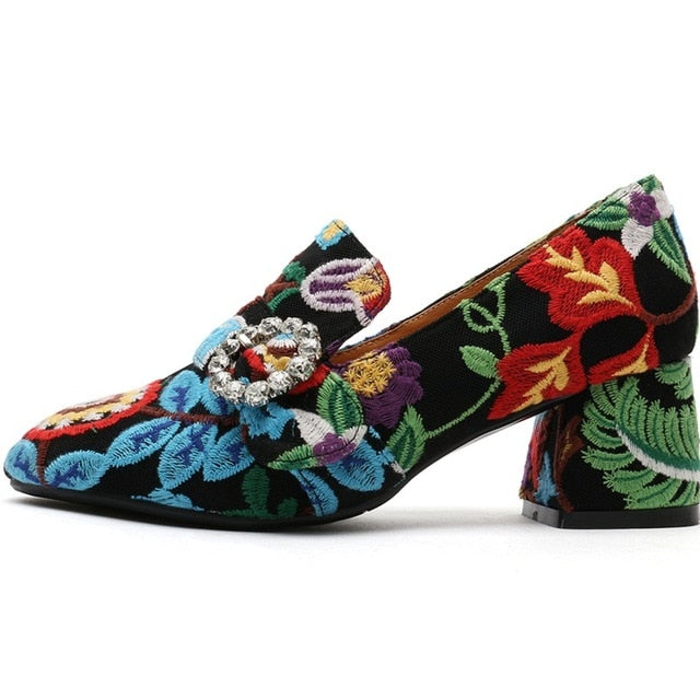 Women Pumps Slip On Retro Printing Thick High Heels