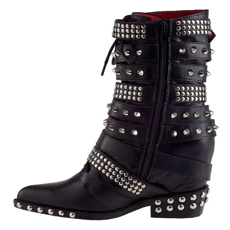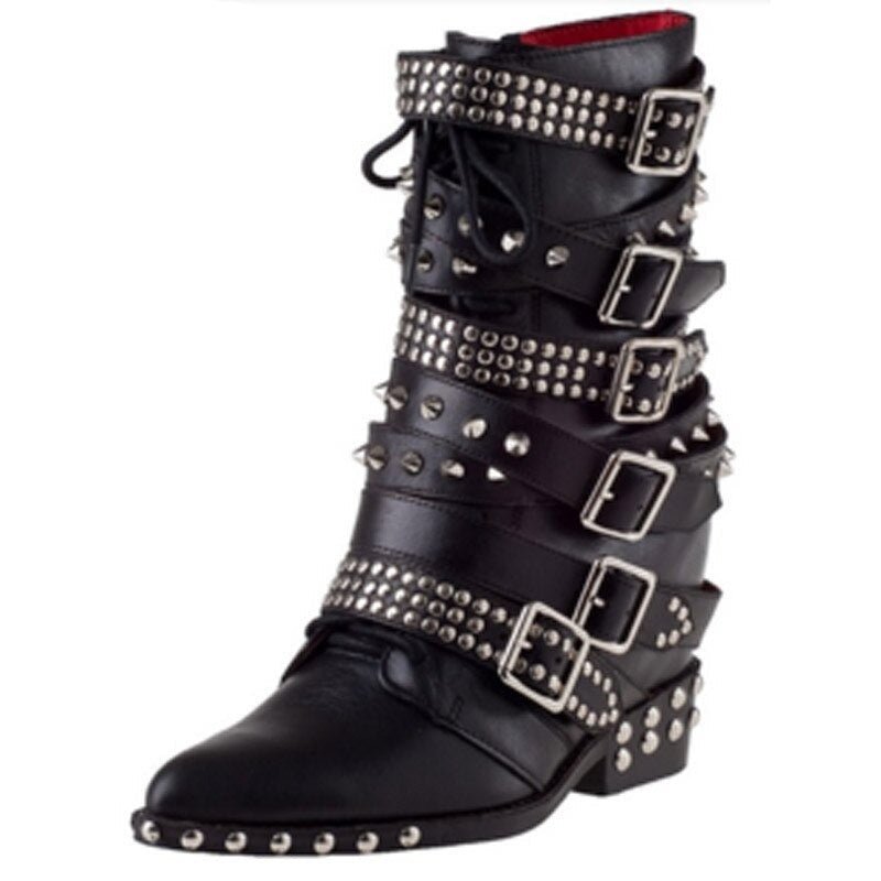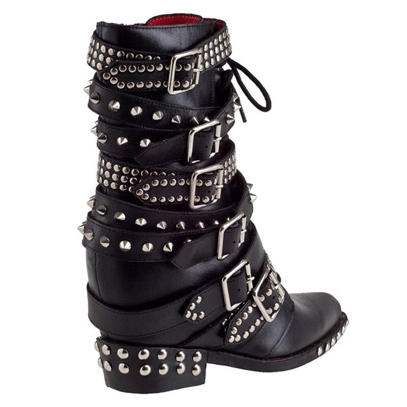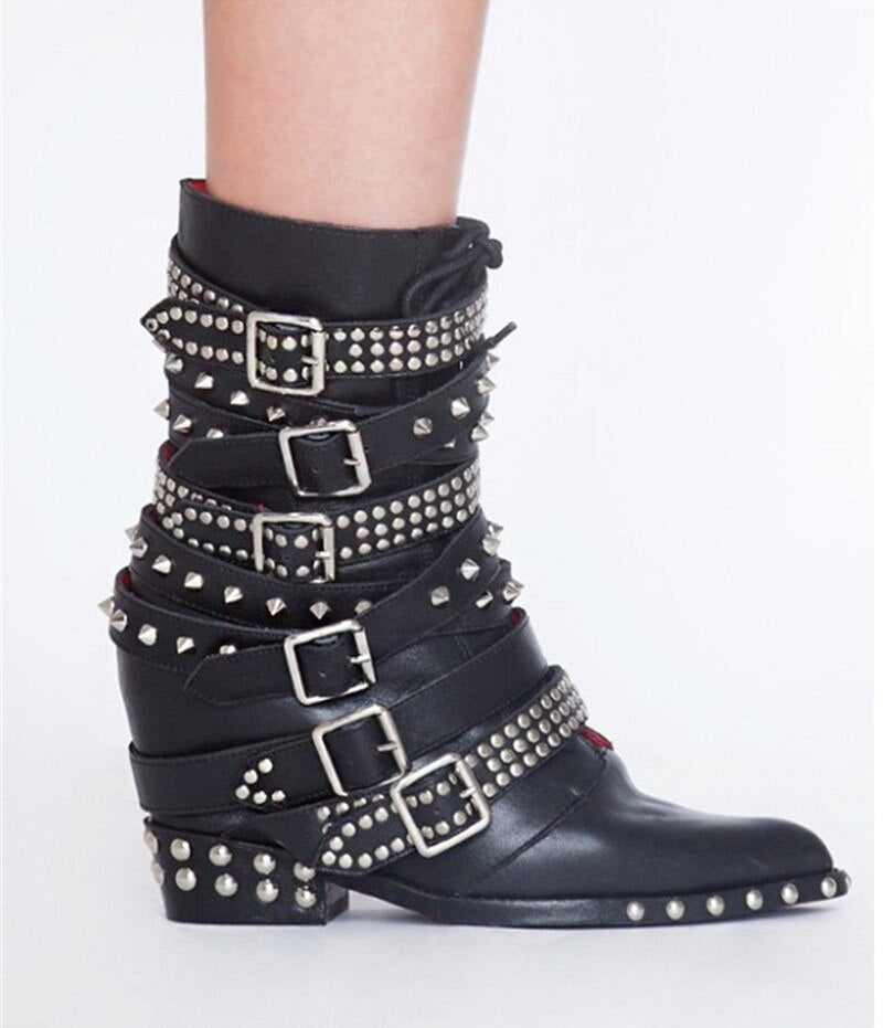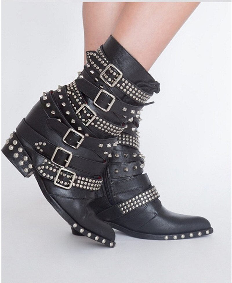 Women Punk Ankle Boots Pointed Toe Buckle Strap Low Heels Shoes