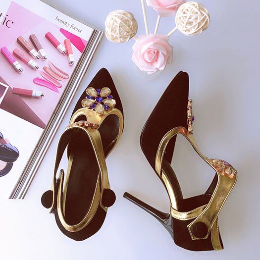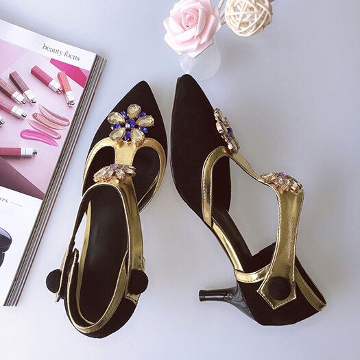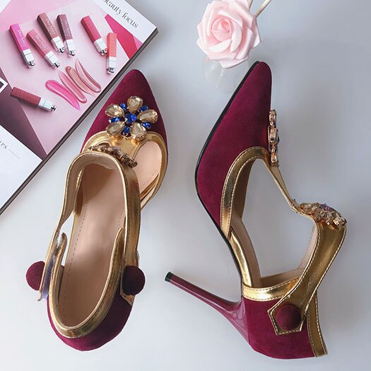 women rhinestone scarpin jewel suede flower female crystal high heels shoes luxury pointed toe pumps wine red t strap diamond