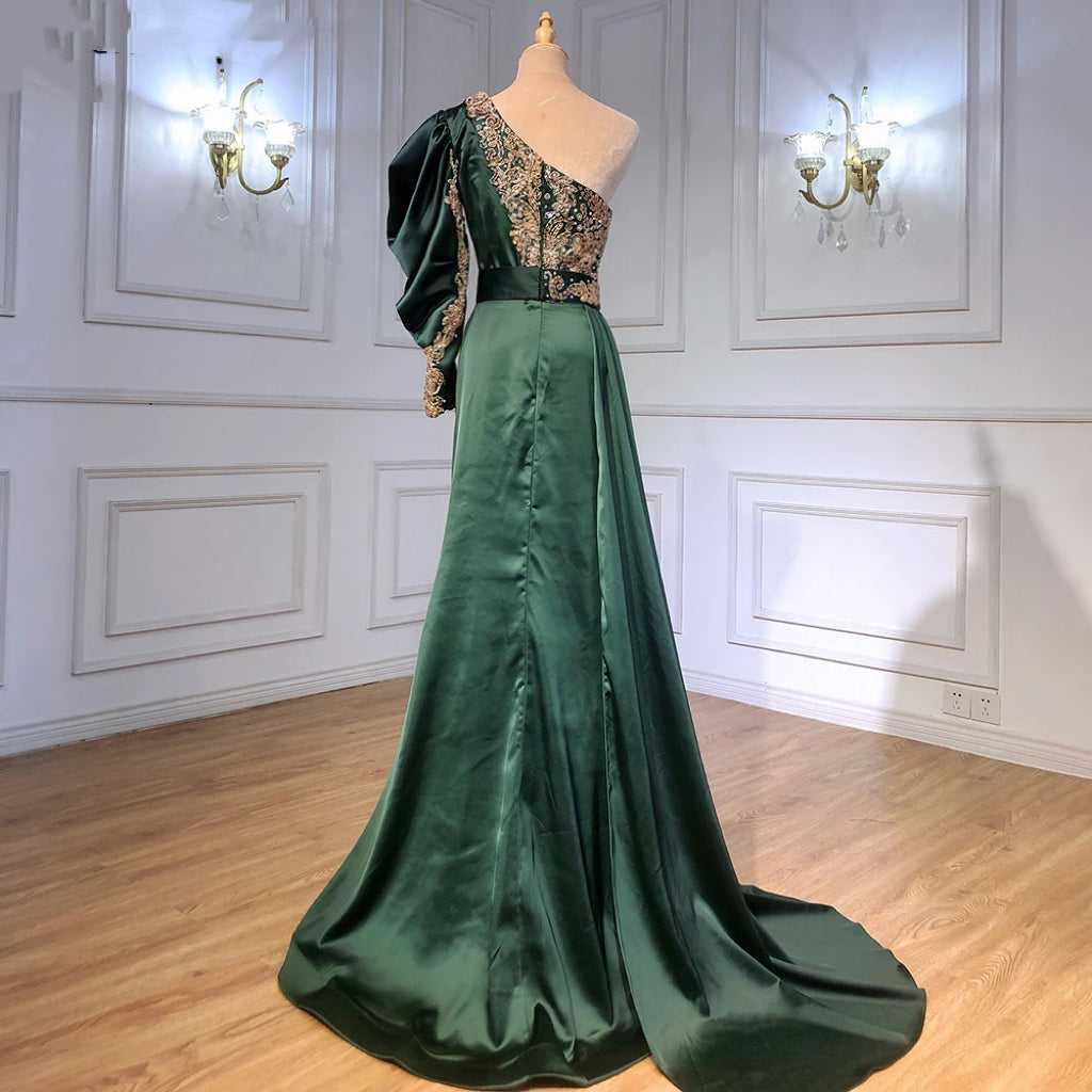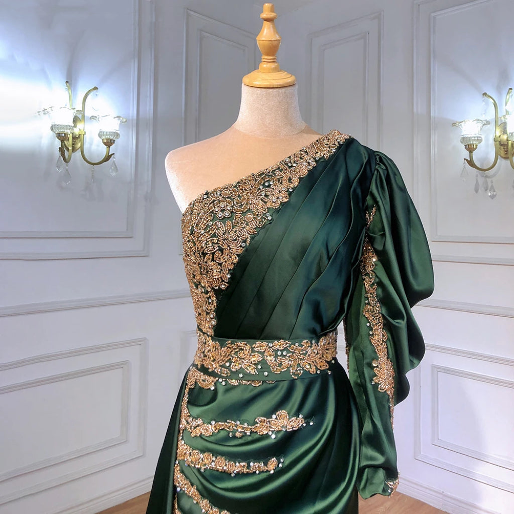 Exude elegance with this women’s beaded one-shoulder mermaid evening dress, perfect for wedding parties and formal events! This stunning gown features a luxurious green satin fabric adorned with intricate beading and crystal embellishments, creating a glamorous and sophisticated look. The one-shoulder neckline, empire waistline, and floor-length mermaid silhouette with a court train accentuate your figure with timeless beauty. Complete with a built-in bra for added support, this dress is ideal for making a statement at any special occasion. Available in green and blue, this gown offers a shade for every style. Pair it with sparkling accessories to complete your elegant look.