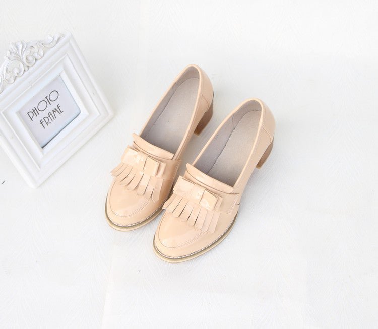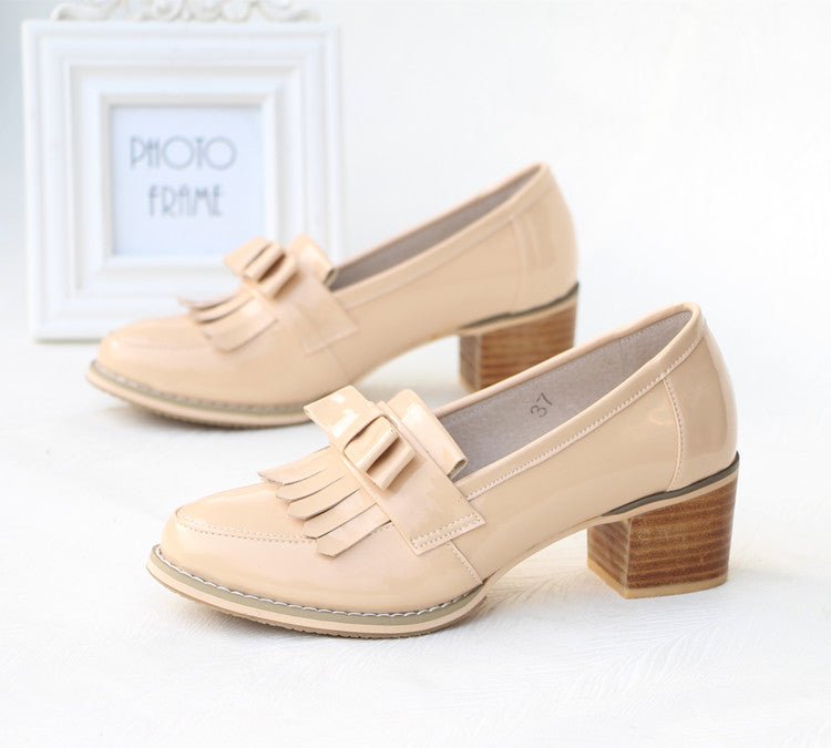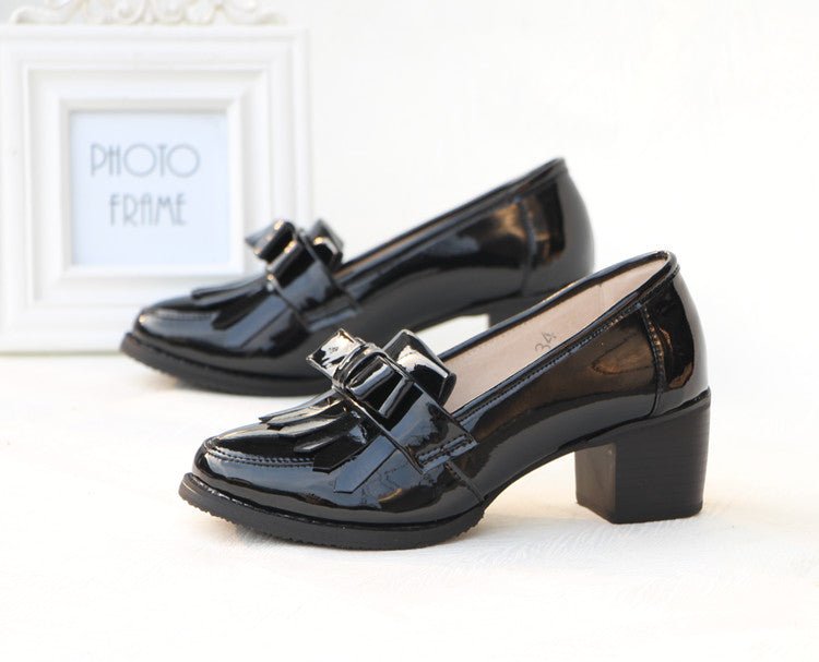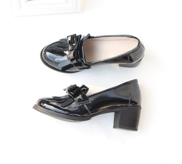 Step into effortless style with our women’s black loafers, featuring a pointed toe, elegant bow, and trendy tassel details. Crafted from glossy patent leather with a 5cm chunky heel, these slip-on loafers offer comfort and durability with a cushioned pigskin insole and TPR sole. Perfect for casual or office wear, they pair beautifully with dresses, skirts, or jeans. Available in black, burgundy, and beige, these stylish loafers combine timeless elegance and everyday versatility.