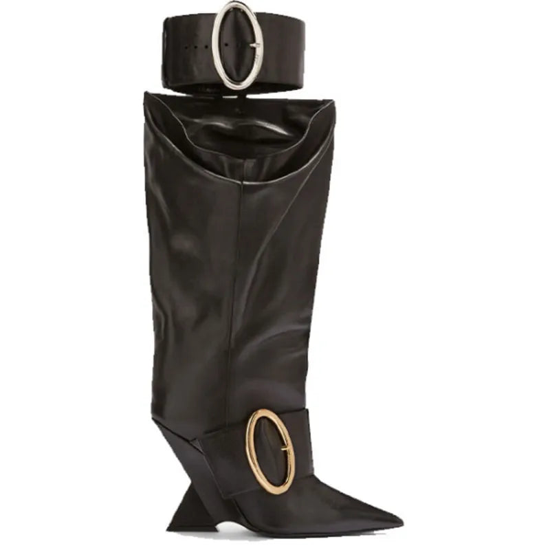 Women's Belt Buckle Knee Length Boots Fashion Pointed Heel Large Thigh High Boots