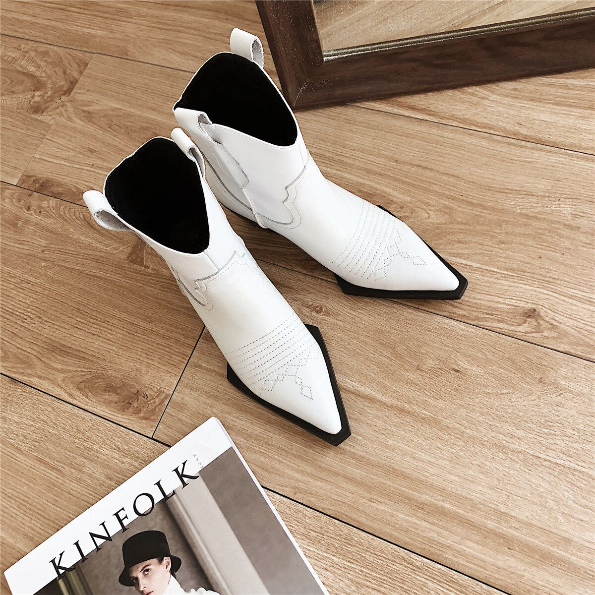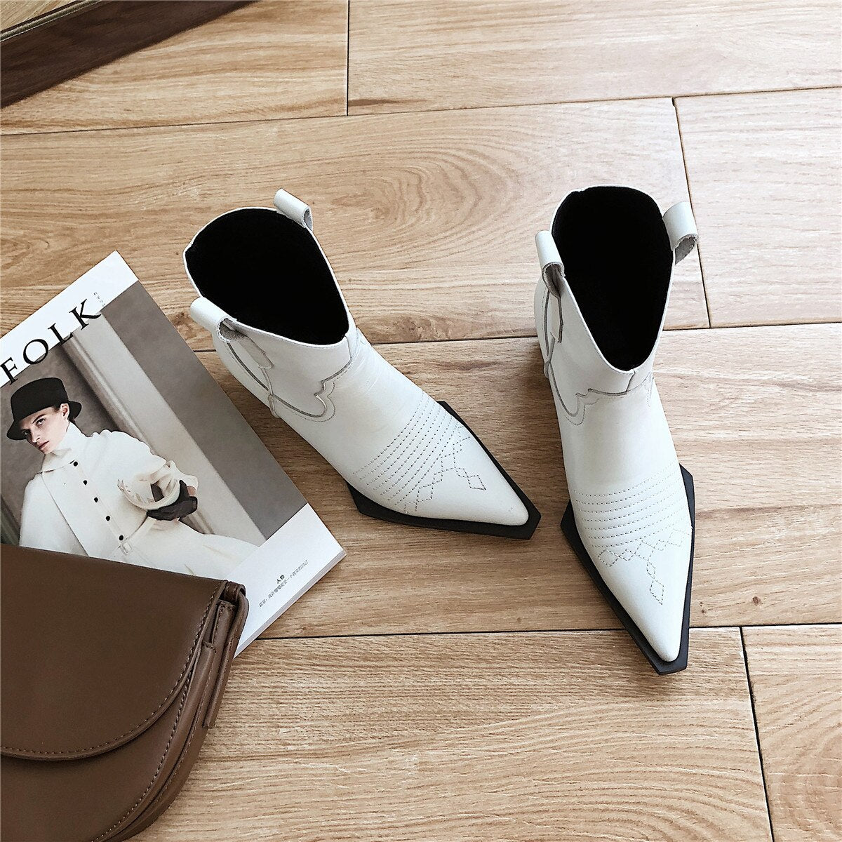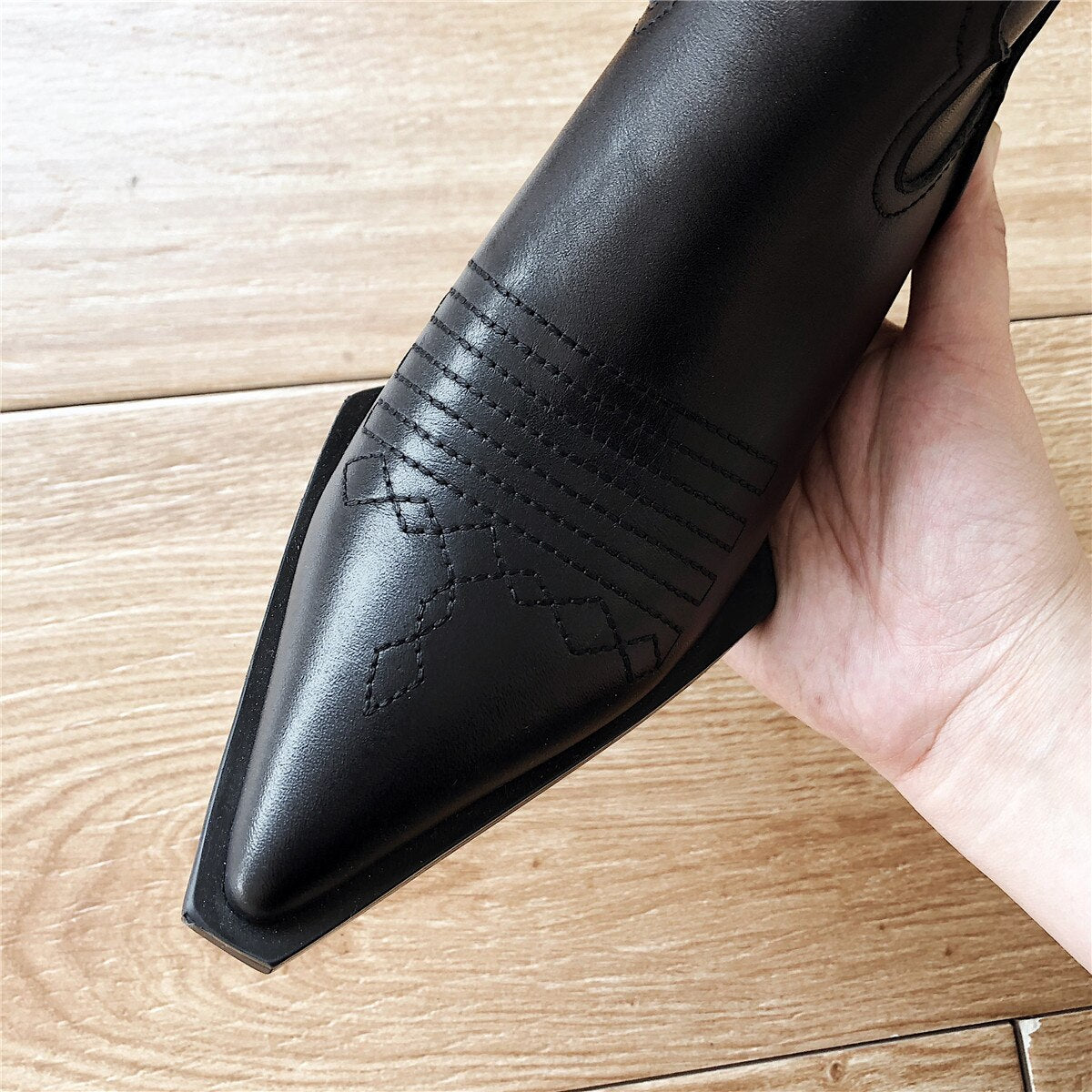 Women's genuine leather slip-on thick high heel ankle boots Sewing thread pointed toe retro vintage autumn short booties shoes